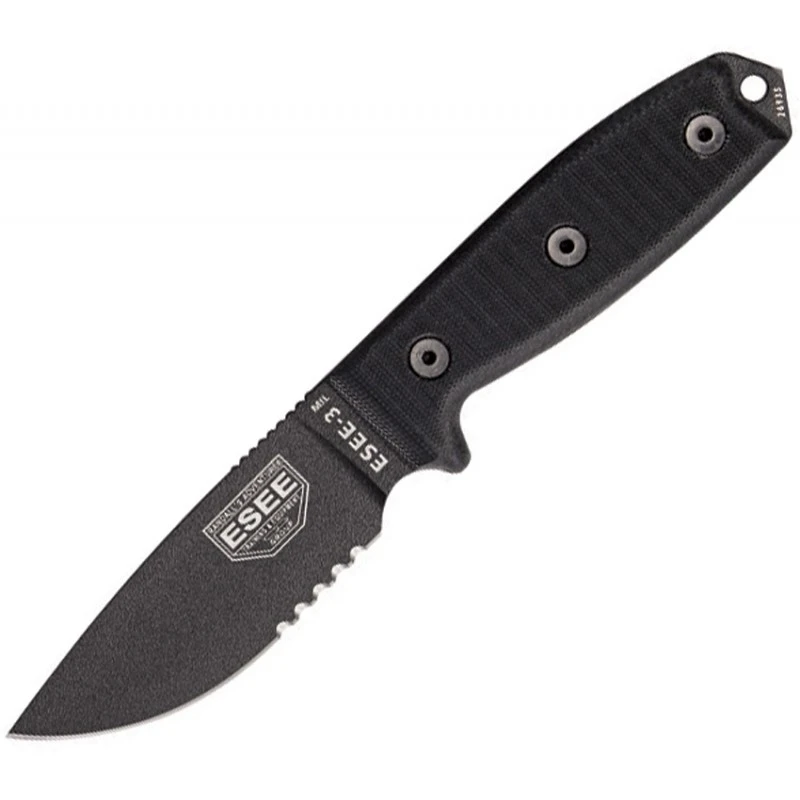 Ce couteau Model 3 Esee contient une lame semi dentelée en acier carbone 1095 d’une longueur de 7.6cm avec une finition noir. D’une longueur totale de 20.3cm ce couteau offre un manche noir G10.