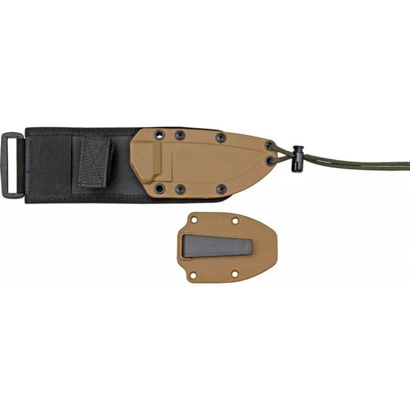 Ce couteau est muni d’un étui moulé marron coyote avec une plaque de fixation à clip et d’un autre étui de ceinture en nylon compatible MOLLE.