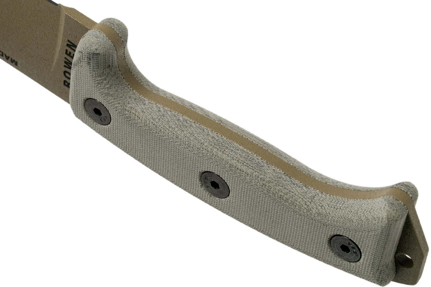 Le Junglas de ESEE Knives est le couteau ultime pour tous ceux qui trouvent une machette trop grande, mais cherchent un grand couteau avec lequel on peut hacher de la végétation. Là où de nombreuses machettes sortent de l’emballage à peine assez aiguisées pour être capable de couper, le Junglas sort de l’emballage avec un tranchant rasoir. Et il est bien lourd, de sorte que trancher la végétation se passe très facilement. Le manche en micarta est grand et très ergonomique. Il a une texture rugueuse pour encore plus de confort et d’adhérence. Si besoin est, les plaquettes de manche en micarta peuvent être dévissées.