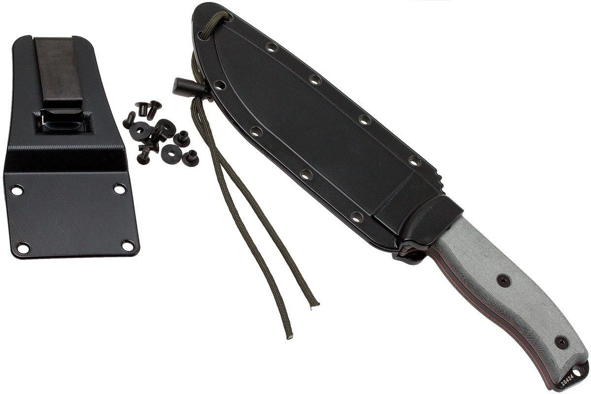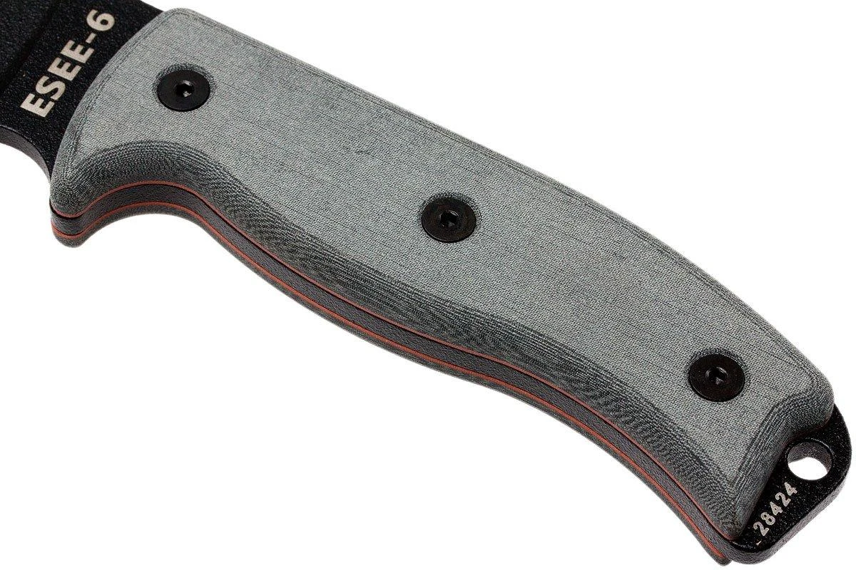 L’ESEE Model 6 est un couteau de survie solide avec une lame en acier carbone 1095. L’acier carbone n’étant pas résistant à la corrosion, un revêtement poudré est appliqué sur la lame pour une meilleure protection contre la rouille. La grande performance de l’acier garantit un plaisir d’utilisation à vie. La lame full tang est entourée d’un manche en micarta. Ce manche est un peu rugueux au toucher ce qui permet une bonne adhérence et un confort d’utilisation optimal. L’ESEE 6 est un couteau large et robuste pouvant résister à une utilisation très rude. Avec un poids de 335 grammes, il est relativement lourd. Un poids lourd au tranchant rasoir.